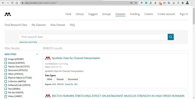 En utilisant Mendeley Data, vous pouvez rechercher 24,4 millions d'ensembles de données à partir de référentiels spécifiques à un domaine et interdomaines.